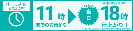 | 仕上がり時間 | 11時までお預かり → 当日18時仕上がり(土日のみ) |